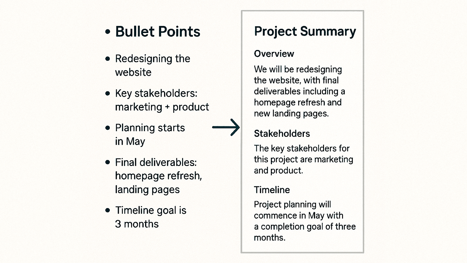 “Summarize these 3 task updates into a weekly report for our exec team.”