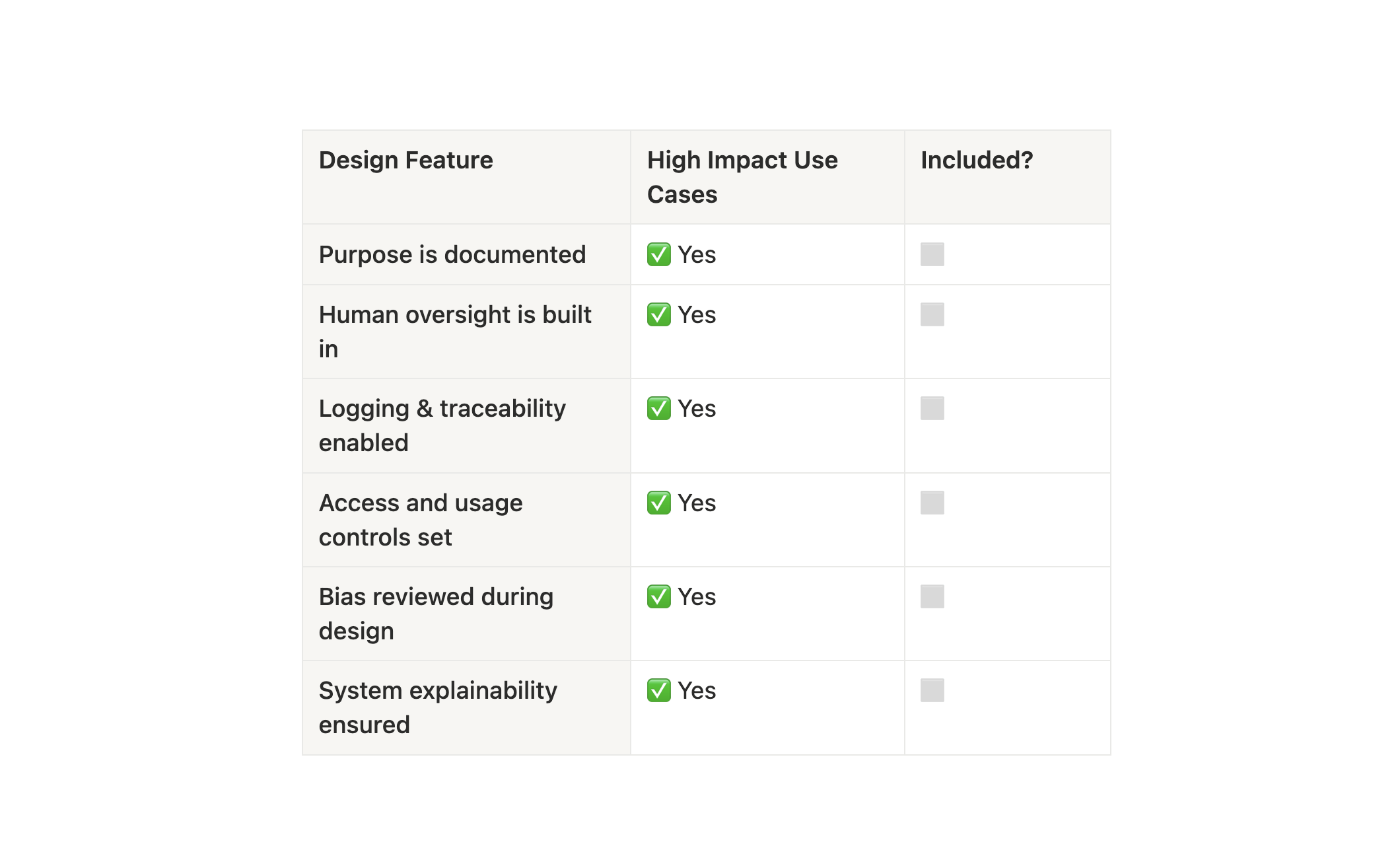 Use this checklist when planning or reviewing any AI system: